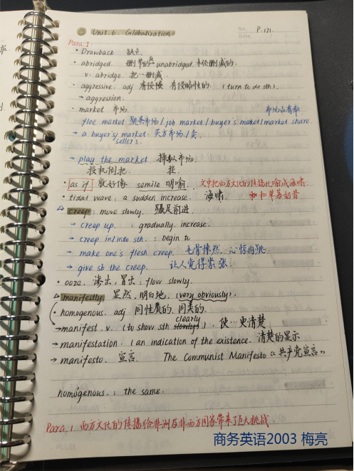 目前我的所有笔记分为两大类:零碎化笔记和专题化笔记。零碎化笔记就是在课堂上记录一些老师讲的或者是书上写的自己不懂的小点,记录下来后可以在课前课后翻看。我会把这类笔记本和课本放在一起,上课的时候方面使用,可以一课一本或者多课一本。我一般用红笔黑笔和一只荧光笔,按照自己的习惯标出重点。专题化笔记就是以不同专题分类记录的比较一大块方面的笔记,在课下看一些比如语法网课等等,根据视频讲的要点完整的归纳整理好。或者是看的一些资料,然后自己整理的笔记。其实做笔记除了记录,更重要的是多去记忆笔记里面的内容,这样笔记才能起到真正的作用。