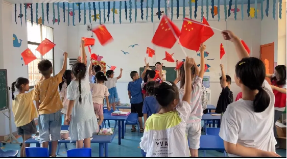 此次宣讲会为期11天,主要以思政课和艺术课相结合的形式开展。7月10日,在同幼儿园老师和同学们沟通协商后,开启了宣讲会的启动仪式,首先章婉怡同学带领小朋友们合唱红色歌曲《我和我的祖国》,小朋友们挥舞着手中的国旗,用稚嫩的童声大声歌唱,表达他们的爱国热情,伴随着音乐的尾声宣讲团成员们正式开讲。