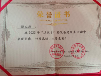 在这次的“返家乡”社会实践活动中,陈文燕同学表现突出,共青团大悟县委特向她颁发了荣誉证书。这份证书激励着她在今后道路中继续展现新时代志愿者昂扬向上的精神风貌。
