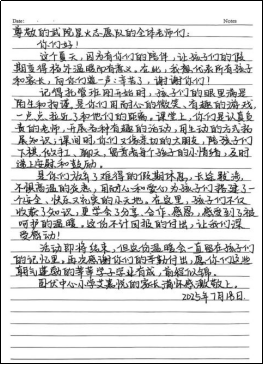 支教期间,志愿者们的付出收获了学生家长的广泛认可与热忱支持。不少家长通过言语赞赏、书信致谢等方式,表达对志愿者的感激。赵炎君父亲:“感谢万博max体育官方网站的同学们,让小朋友们度过了一个愉快的夏令营,学习很多书本以外的知识,变得开朗大方,积极向上。作为家长们,很满意,很幸福。”周欣雨母亲:“感谢武院星光导航班的哥哥姐姐和校领导,让孩子们度过一个愉快温暖的夏令营,同时也祝福你们,未来学业有成,前程似锦。”黄骏皓母亲:“感谢老师们这段时间的辛苦付出,让孩子们学习到了更多课本以外的知识,看着孩子们和老师的互动,那一张张笑脸,是发自内心深处的情感,虽然有很多不舍,但是也更期待下次的相遇。”