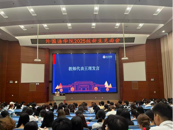 教师代表王理上台发言。王理老师结合自身丰富的教学经验,向新生们分享外语学习的方法与心得,着重强调学习的主动性和持之以恒的重要性,希望新生们能始终保持对英语学习的热忱,在未来的学习征程中不断进步。