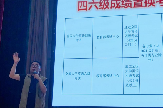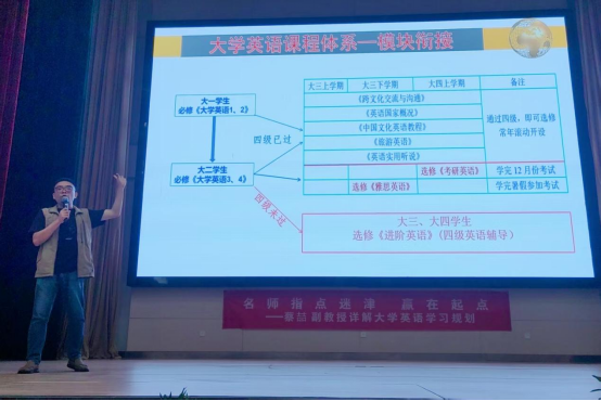 讲座围绕大学英语课程体系、学习要求、学习规划三大模块展开。蔡喆老师开宗明义地指出,在成果导向教学理念下,通过大学英语四级考试是衡量学习成效的关键指标,也是提升就业竞争力的重要基石。