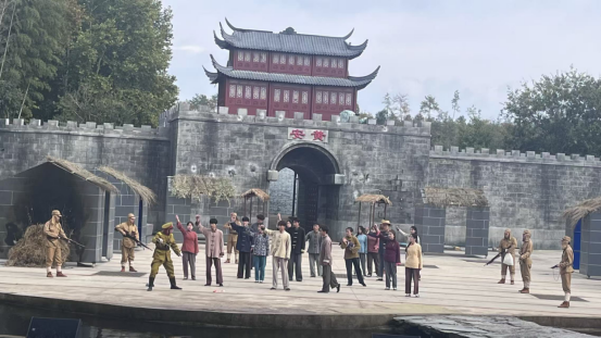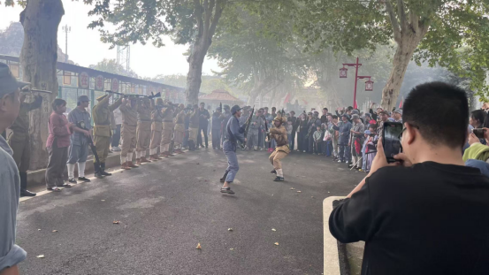 活动的沉浸式体验环节在参与抗战实景剧中达到高潮。党员教师们换上军装,化身“战士”,手持装备,瞬间“穿越”回烽火连天的抗战岁月。震撼的声光特效、逼真的战场场景,生动再现了大别山儿女同仇敌忾、浴血奋战的壮烈史诗。党员老师们还积极参与到军事训练中,学习刀术、操练红缨枪,并“冲锋上阵”体验战斗场景。这种沉浸式、互动式的体验,使全体人员在强烈的情感共鸣和身临其境地感受中,对抗战精神的伟大与崇高有了更为透彻地领悟
